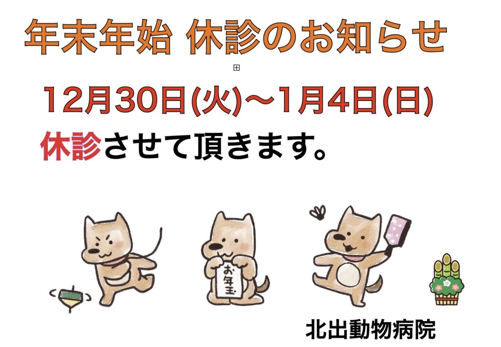 ホーム お知らせ 院紹介 診療項目 診療の流れ お問い合わせ お知らせ 年末年始のお知らせ 12月30日(火)から1月4日(日)まで冬季休暇とさせていただきます。 フード・お薬の在庫にお気をつけください。 2025年11月25日 « 前の記事へ 最近の投稿 年末年始のお知らせ 臨時休診のお知らせ 夏季休暇のお知らせ 臨時休診のお知らせ 臨時休診のお知らせ アーカイブ 2025年11月 2025年9月 2025年7月 2025年6月 2025年3月 2025年1月 2024年12月 2024年11月 2024年7月 2024年6月 2024年5月 2022年9月 カテゴリー お知らせ